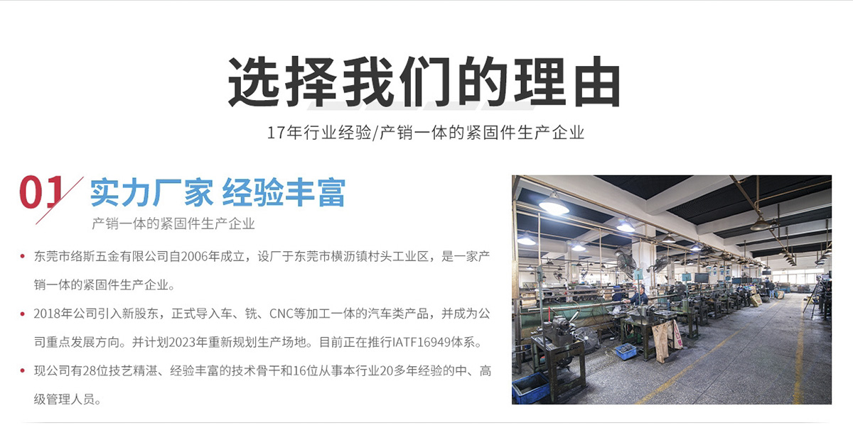 東莞市絡(luò)斯五金有限公司自2006年成立,設(shè)廠于東莞市橫瀝鎮(zhèn)村頭工業(yè)區(qū),是一家產(chǎn)銷一體的專業(yè)緊固件生產(chǎn)企業(yè)。