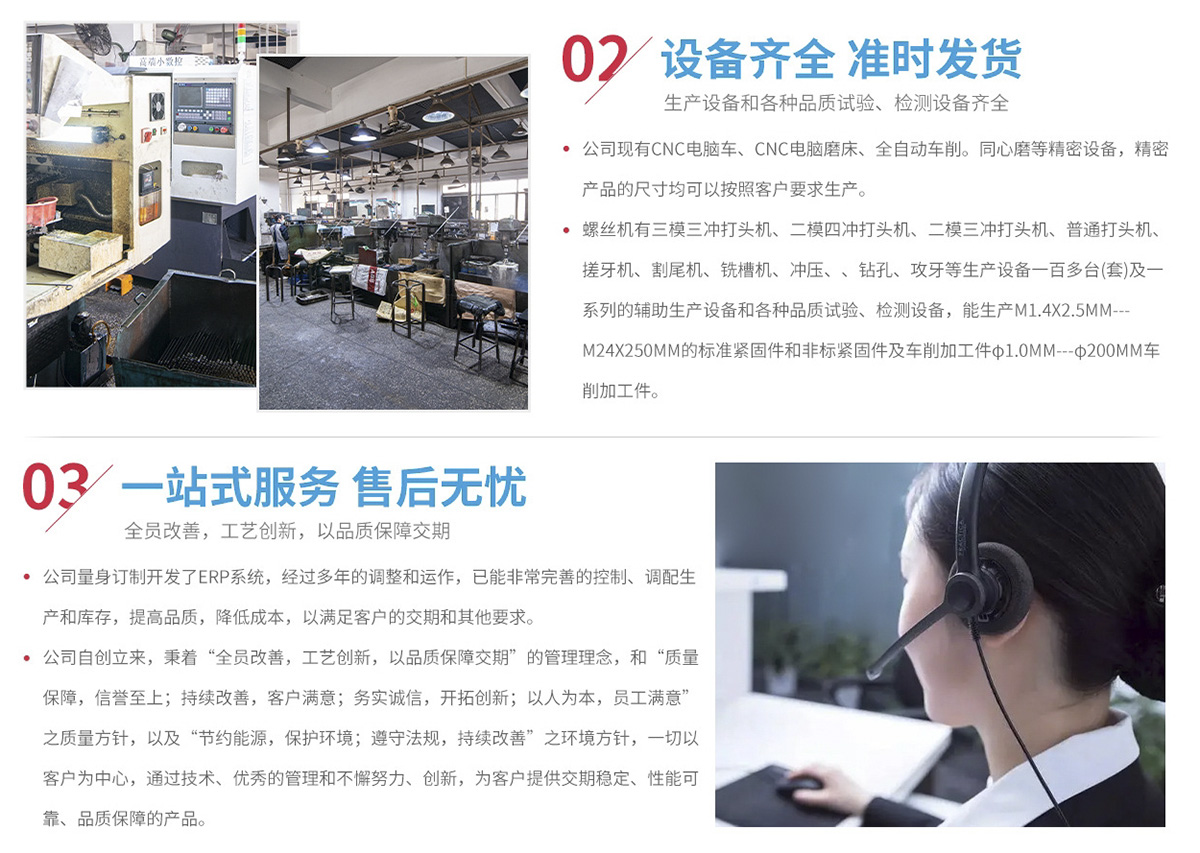 主要生產(chǎn)非標(biāo)件(止付螺絲、自攻牙螺絲、木牙螺絲、機(jī)械牙螺絲、加長螺絲、高強(qiáng)度螺絲、螺桿、軸、銷等)和標(biāo)準(zhǔn)件(國標(biāo)、美標(biāo)、德標(biāo)、日標(biāo)、英標(biāo)等)。